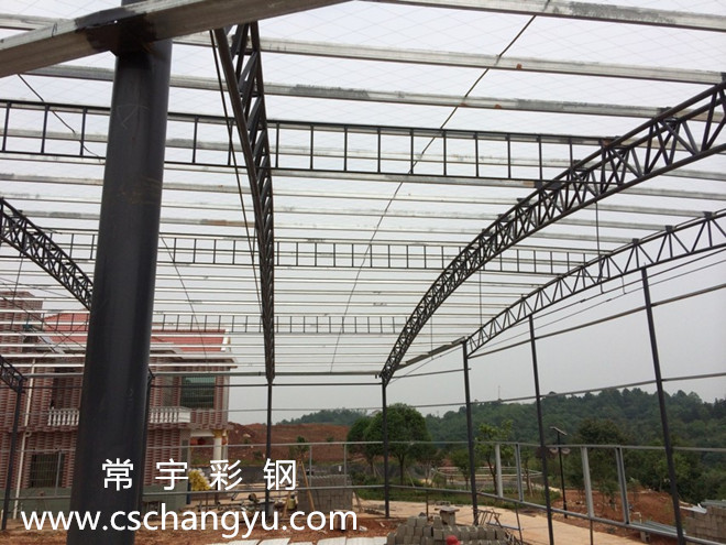 發(fā)布時間:2014-5-22來源:常宇彩鋼作者:常宇彩鋼瀏覽次數(shù):(0) 長沙鋼結構弧形棚廠房_異形棚廠房【設計,制作,安裝】_長沙縣白竹